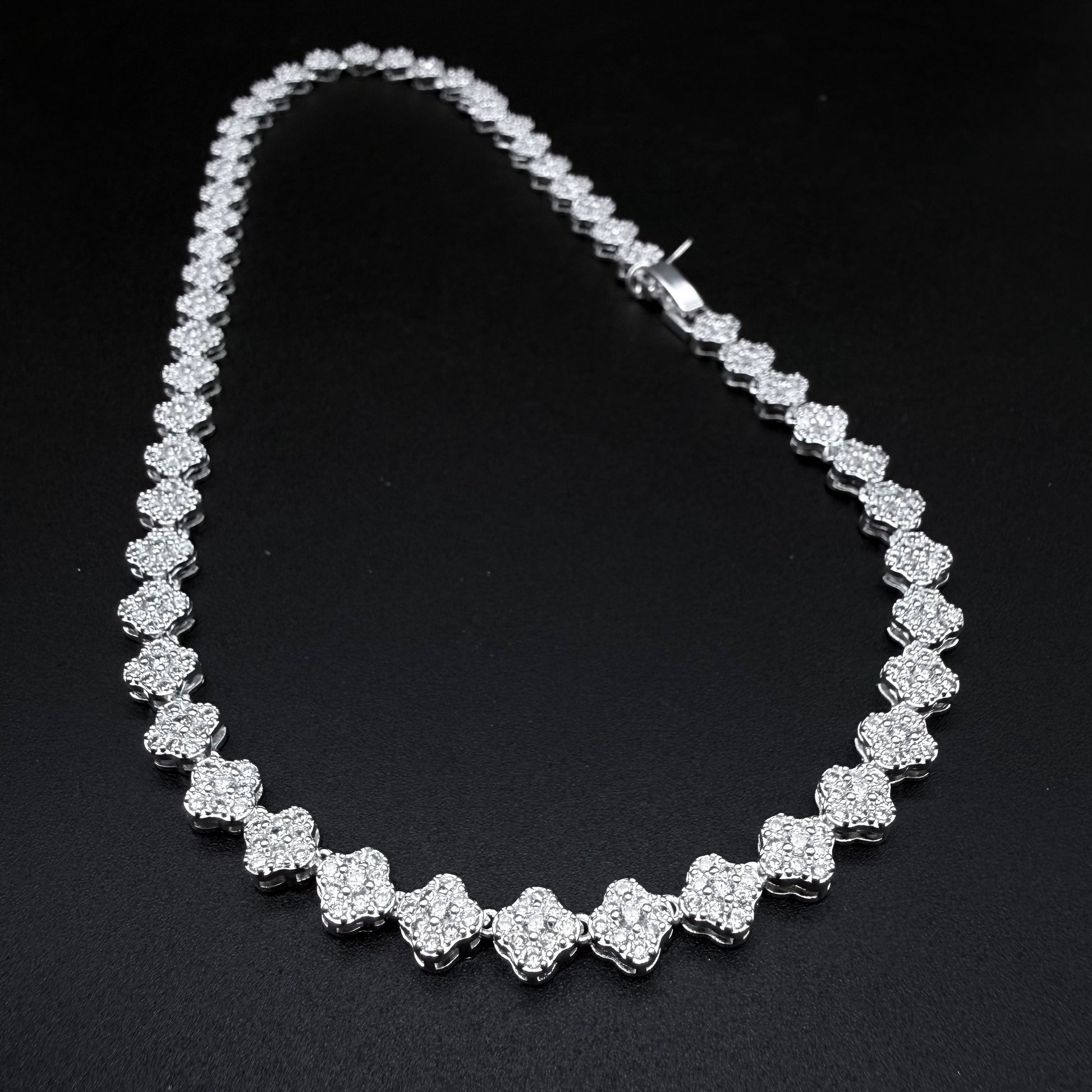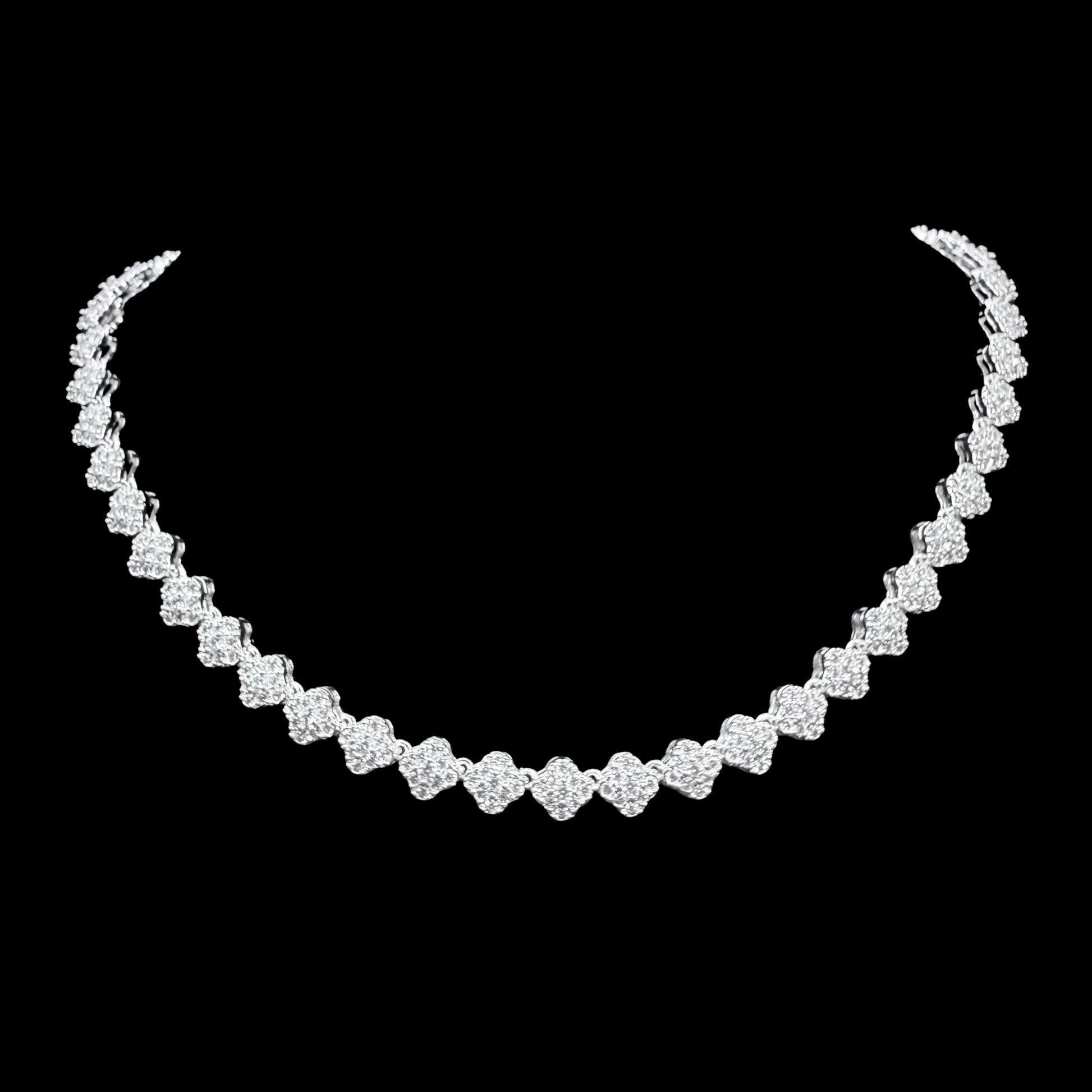 El Collar Van Cleef en Plata 925 es una pieza que fusiona elegancia y brillo con un diseño atemporal. Con largo de 41 cm, su detalle en forma de trébol está finamente cubierto de micro circones, reflejando luz sutil y llamativo.