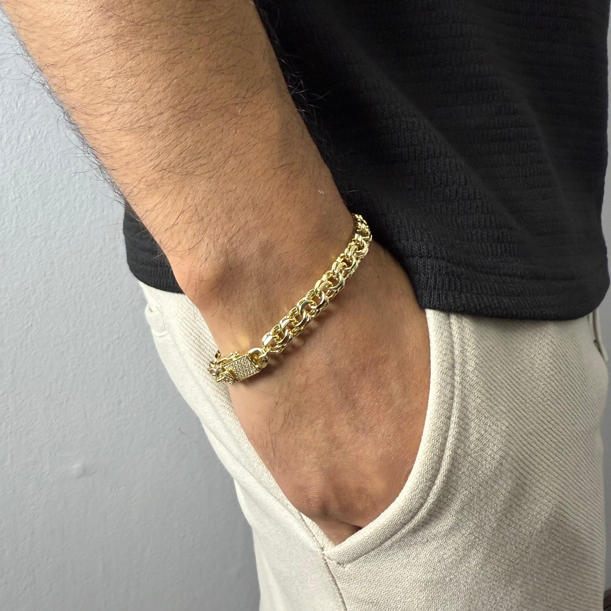 La Pulsera Doble Rolo en Oro 14K Gold Filled combina estructura firme con detalles que brillan. Sus eslabones redondeados y limados aportan textura, mientras que el broche de cajón adiamantado con circones añade un cierre seguro con un toque de lujo.